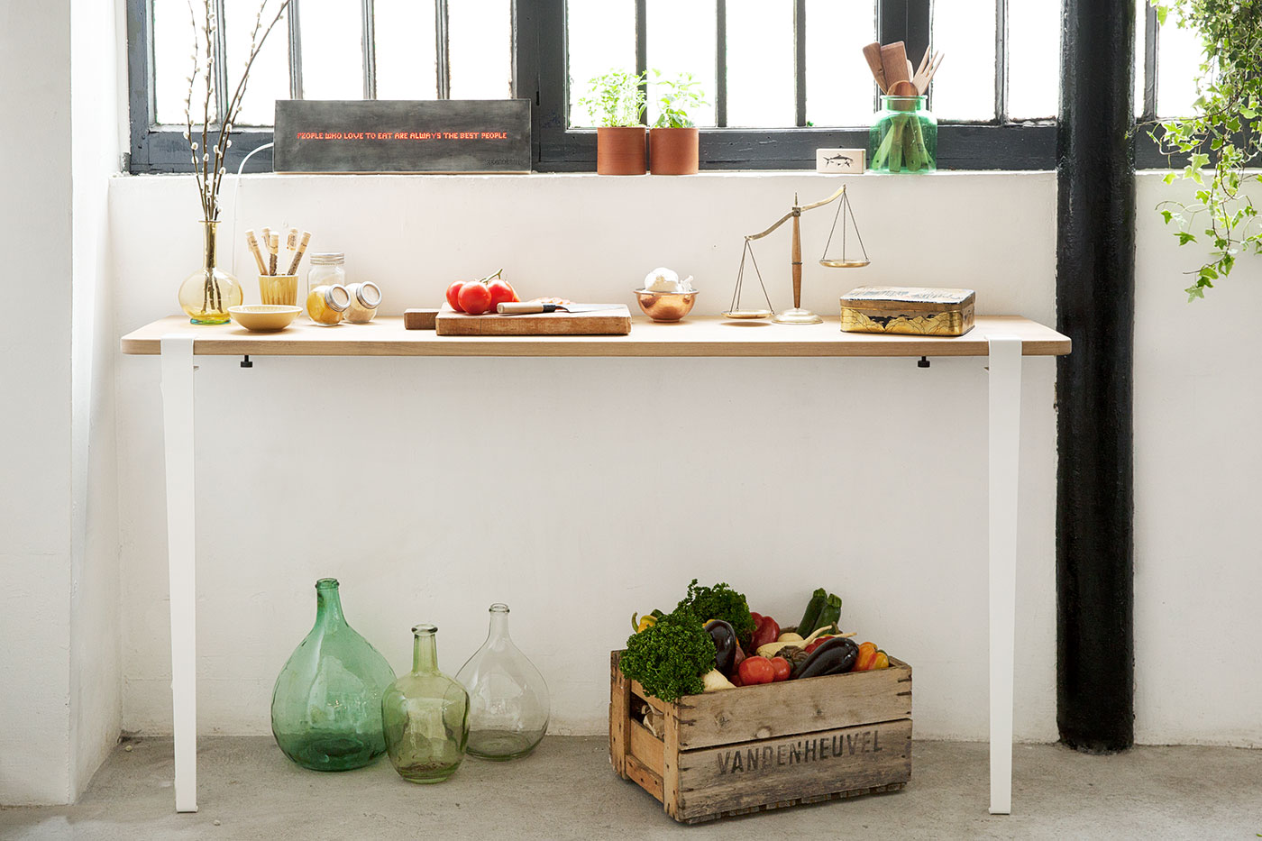 Das 90 cm hohe Tischbein von TIPTOE ermöglicht es, eine individuelle Arbeitsplatte zu gestalten. Seine Höhe entspricht der einer Küchenarbeitsplatte. Kombinieren Sie ihn mit der Tischplatte Ihrer Wahl und befestigen Sie ihn mit dem BRACKET-Wandhaken an der Wand, um eine einzigartige, maßgeschneiderte Arbeitsplatte zu erhalten.