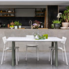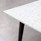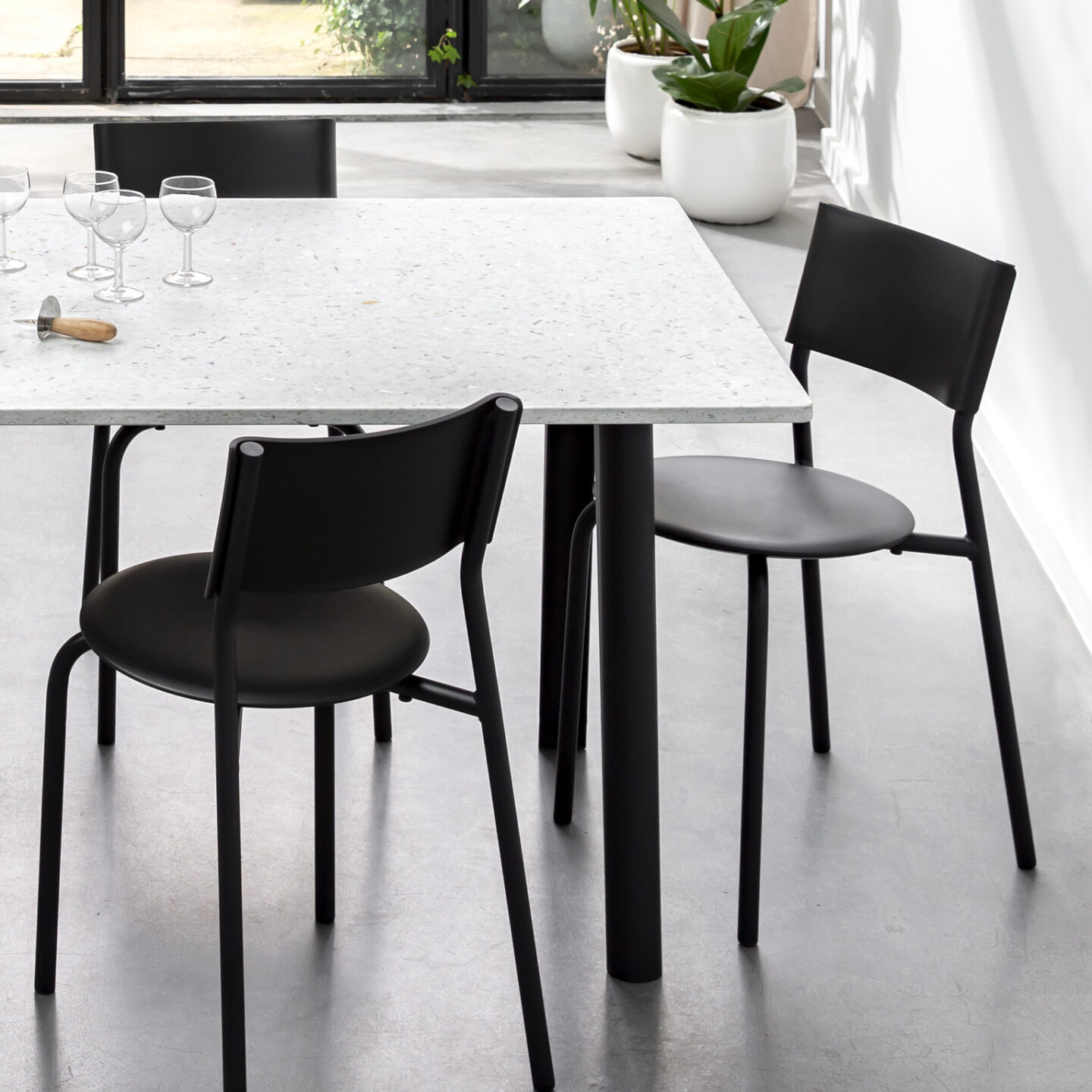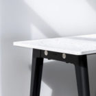 Ein NEW MODERN Tisch besteht aus zwei Stahlbeinen, in die zwei Edelstahlträger eingelassen sind. Die Tischplatte wird in die Struktur eingelegt und mit ihr verschraubt (bei größeren Formaten vervollständigt eine bewegliche Querstange den Aufbau in der Mitte der Tischplatte).