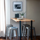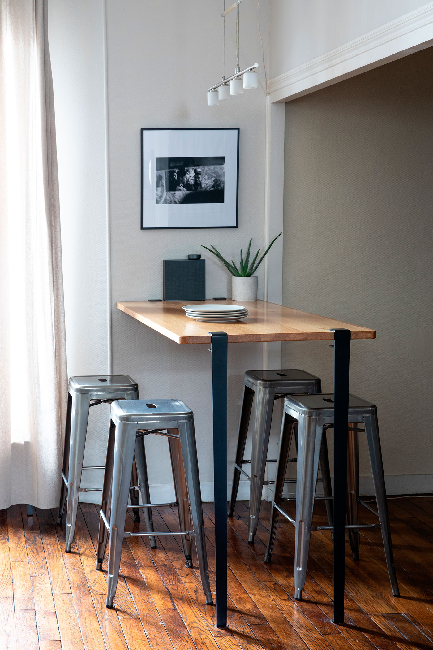 The 110cm TIPTOE table leg can be used to make a bar table, a standing desk, a stand-up table or a high console with a wide variety of tops and a wall bracket.