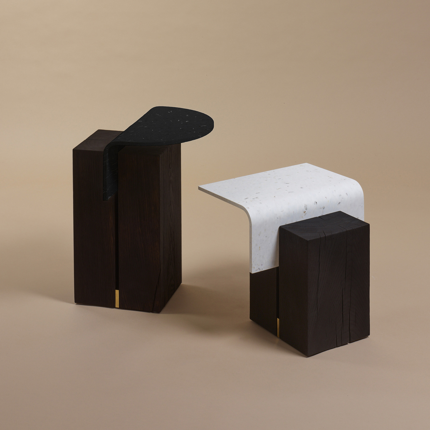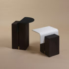 “The legs of the Ghan table have stories to tell: they are cut from the offcuts of railway sleepers or carpentry and then stained with Brou de noix . The recycled and bent plastic tray is slid between two solid wood blocks. A balance is created between the dense and rough base of the table and the soft lines of the top.