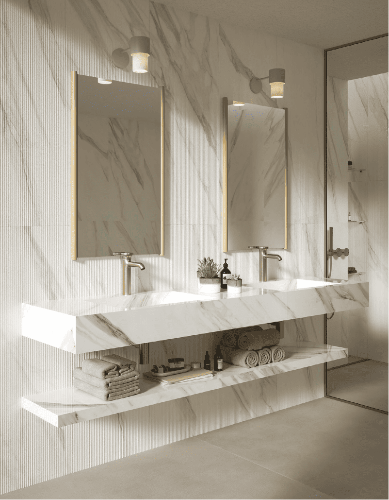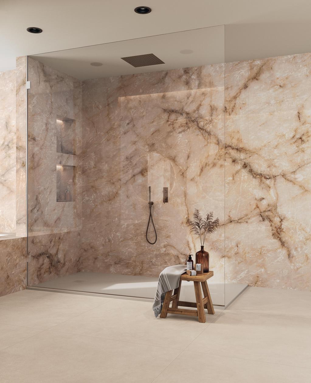 Le grès cérame effet marbre rend hommage à la beauté intemporelle des pierres naturelles les plus fines, en évoquant leur potentiel expressif avec un réalisme absolu.