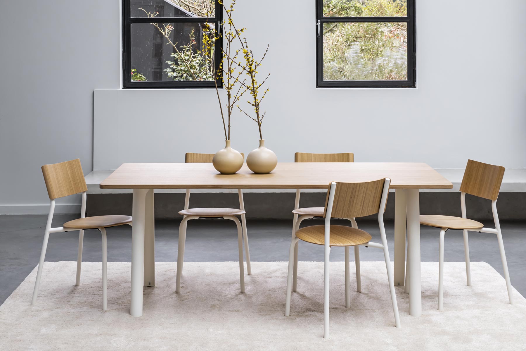 Disponible en bois éco-certifié, 3 coloris de bois et 4 coloris de pied. Version soft avec la chaise SSD Soft, disponible en 4 coloris, dossier bois. Version recyclée avec le modèle SSD, disponible en 4 coloris.