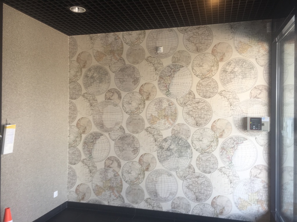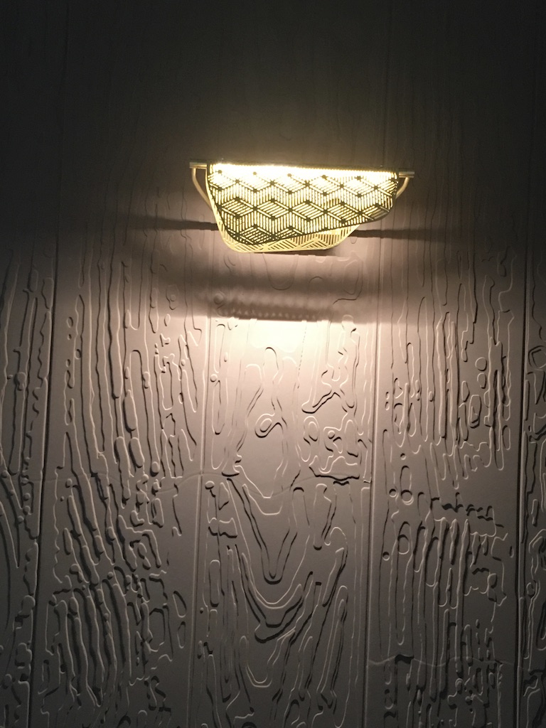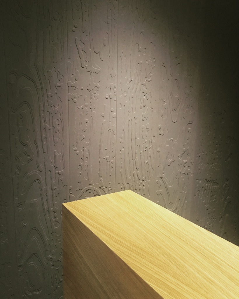 Pour parfaire l’ensemble, les murs sont tapissés avec un revêtemenet 3D étonnant de chez Élitis.