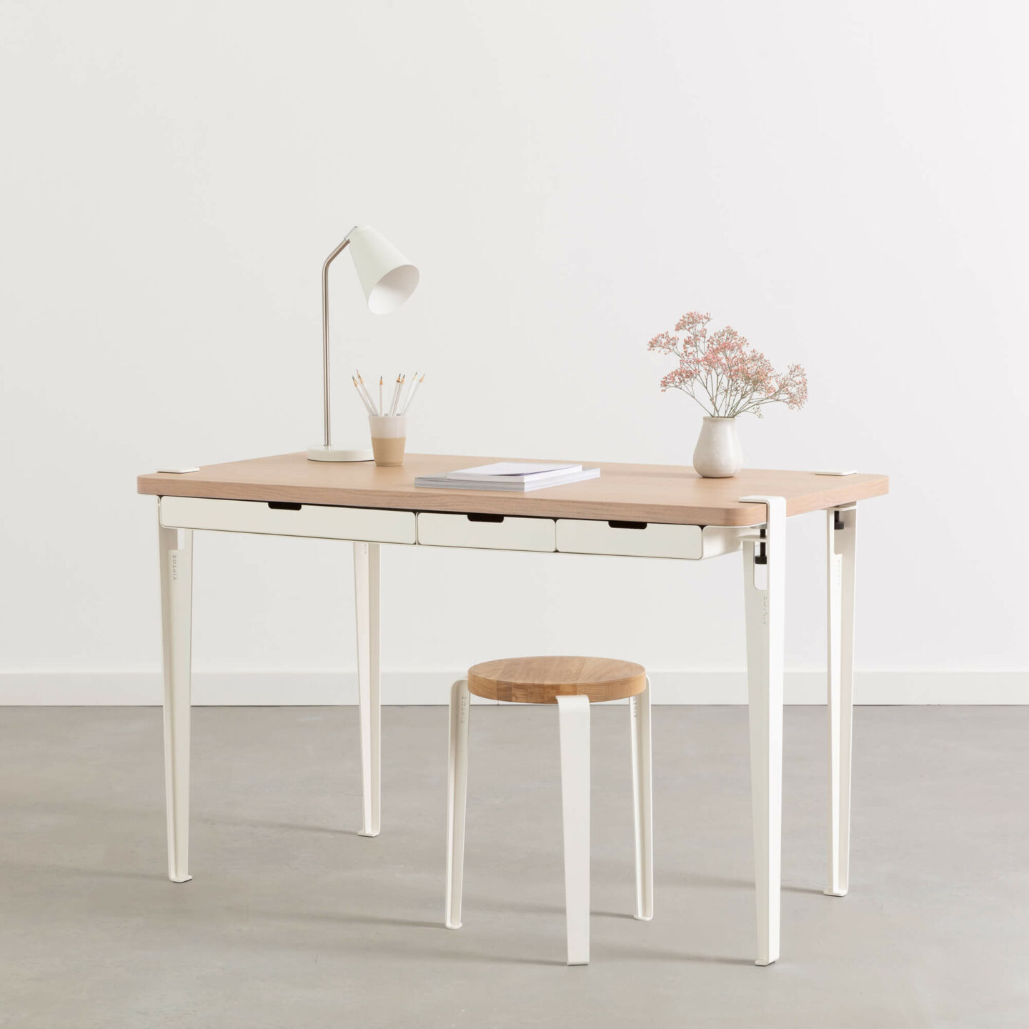 Ce bureau associe 4 pieds TIPTOE 75cm, un plateau 120x60cm en chêne et le module de rangement WAVE où viennent se loger trois tiroirs en acier.