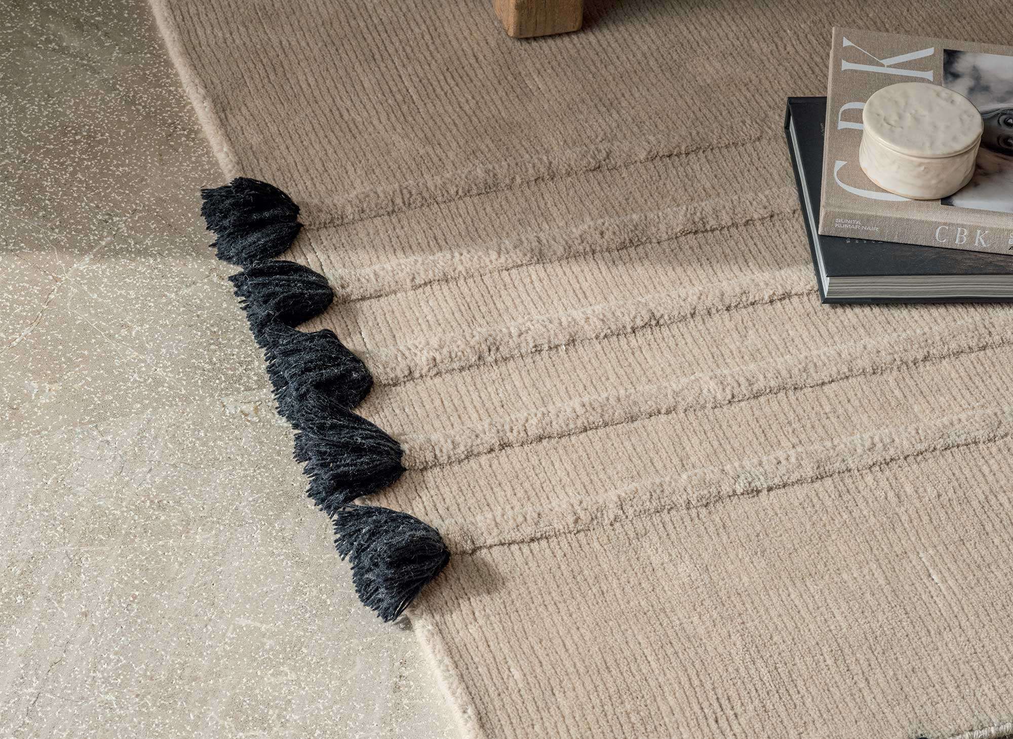 Avec ses pompons faits main et ses rayures irrégulières, chaque tapis Ernest est unique.
