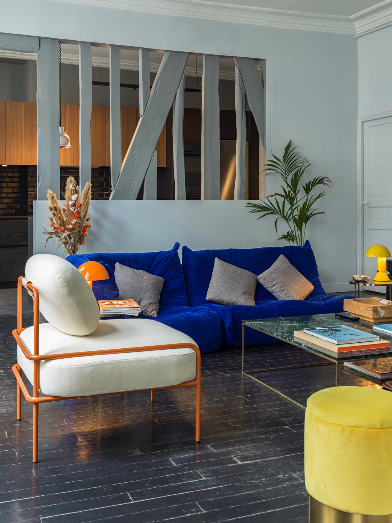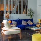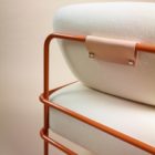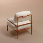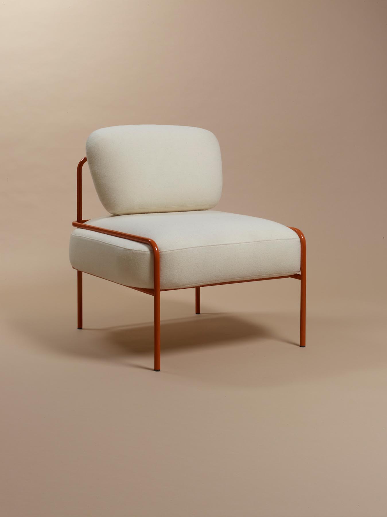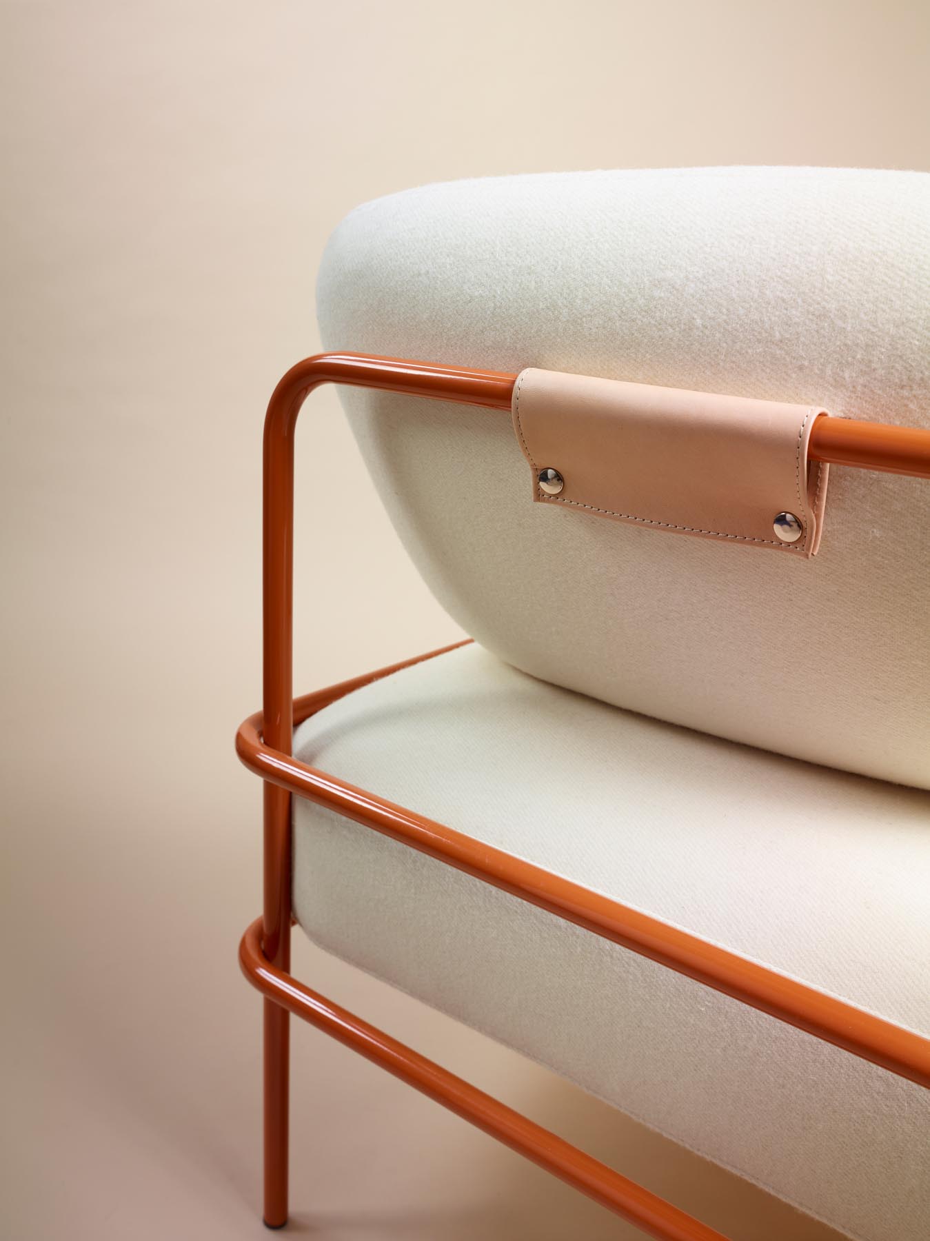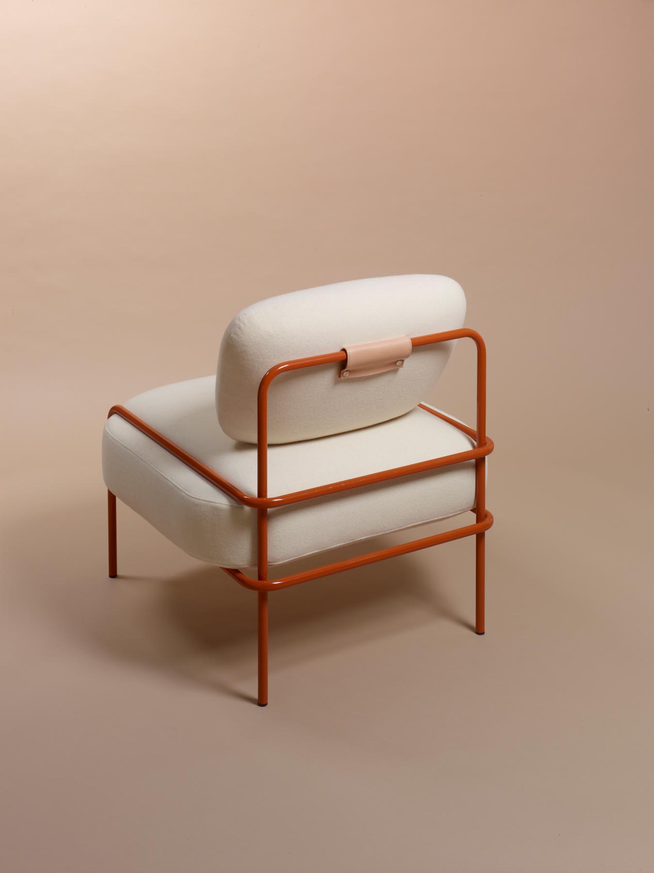 « De prime abord, Laime ne relève pas le pari du recyclage. Travaillé autour du coussin d’assise, le fauteuil Laime est composé d’une structure en acier tubulaire sur lequel le dossier vient se poser. L’assise déborde de la structure et semble glisser entre les tubes de métal. Un effet pincé donne une générosité à l’ensemble. »
