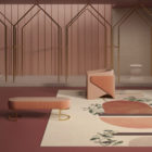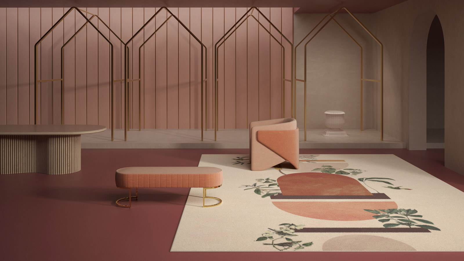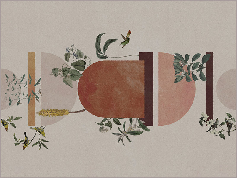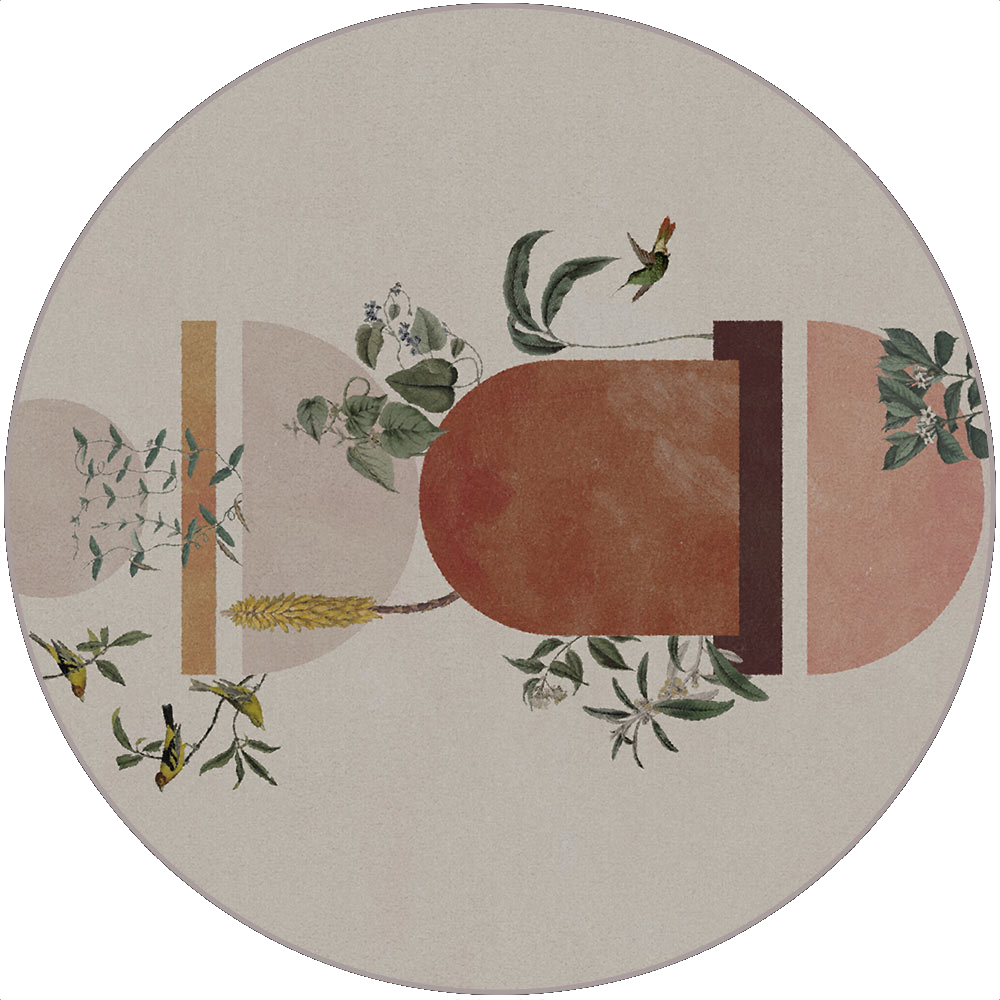 Ce tapis représente un paysage imaginaire où la nature joue avec des formes géométriques. Des oiseaux volent à travers ce paysage mystérieux. Équilibrant le réalisme et l’abstraction, cette série de 3 coloris mêle les détails méticuleux de la botanique aux formes géométriques libres.