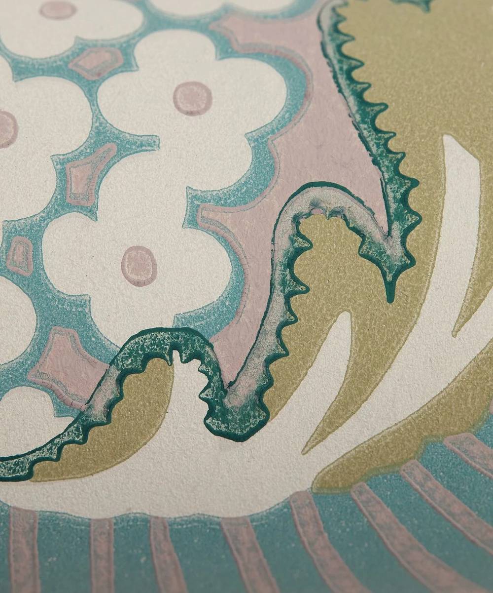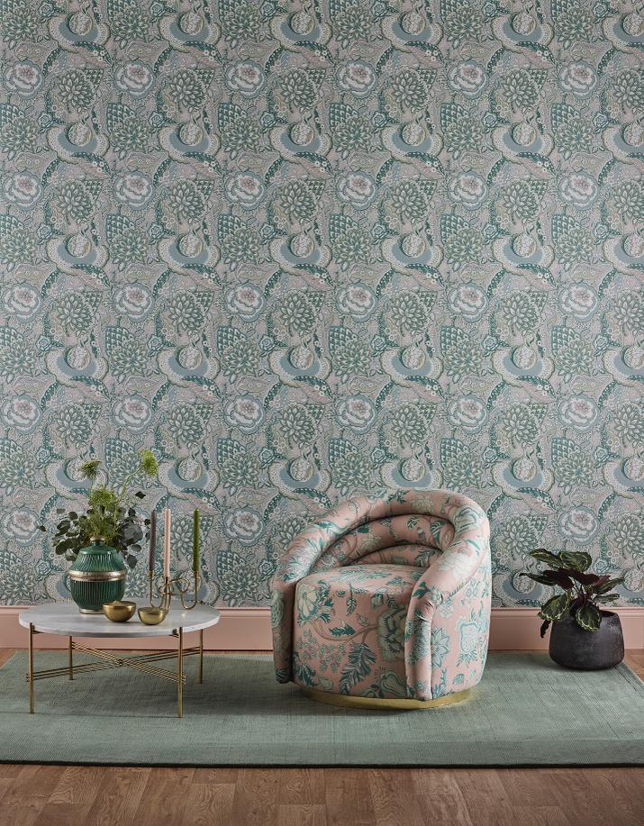 L’équipe s’est inspirée de la coloration audacieuse des teintures mordantes et des pigments naturels. Imprimé sur un fond non tissé irisé pour les papiers peints et sur du lin en aplat pour les tissus, Palampore Trail resplendit de riches nuances qui rappellent ces teintures exquises de plantes et d’insectes.